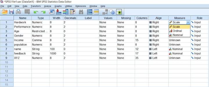 الآن في SPSS ، إذا نظرنا إلى المعالج ، فسنرى متغيرات اسمية وترتيبية ومقياس.